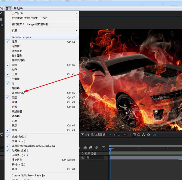 2、接下来我们点击窗口,打开预设和效果面板。