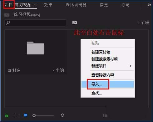 1、打开pr,在“项目”面板空白处右击鼠标,选择“导入”,导入两段视频素材