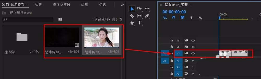 2、将视频素材拖到v1轨道上