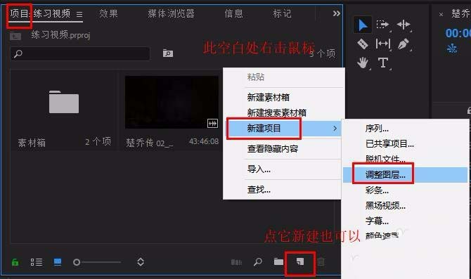 3、在“项目”面板空白处右击鼠标,选择“新建项目”-“调整图层”,点击“确定”