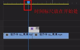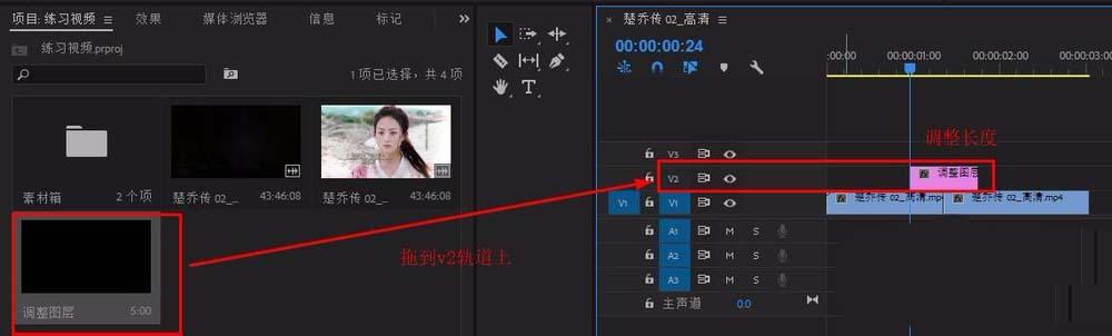 4、将调整图层拖到v2轨道,置于两个视频中间,调整长度
