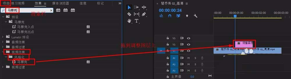 5、在“效果”面板搜索栏输入“马赛克”,将其拖到调整图层上,(“视频效果”-“风格化”-“马赛克”)