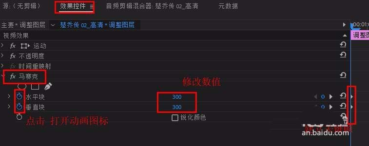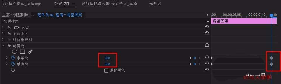 6、选中调整图层,在“效果控件”面板中找到“马赛克”,时间标尺移到调整图层开始处,打开“”前的动画图标,设置开始关键帧,修改数值为“水平块”300 ,“垂直块”300