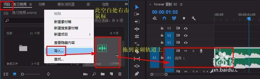 1、打开pr,在“项目”面板空白处右击鼠标,选择“导入”,导入音频素材,将音频素材拖到v1轨道上