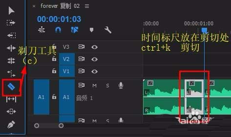 2、将要改变声道的音频片段ctrl+k 裁剪出来