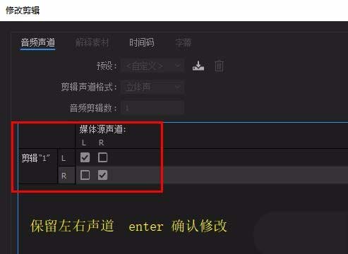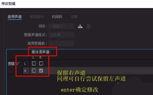 4、修改媒体源声道,变单声道——可点击L(左侧)或R(右侧)其中一个,只留一个声道即可。按enter键确定。