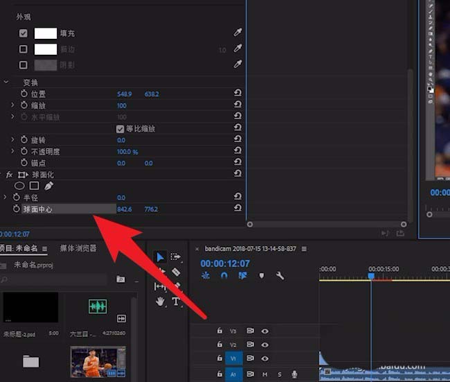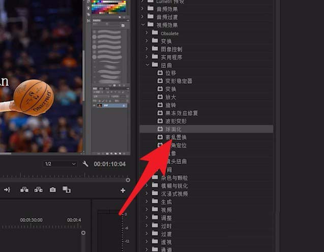 3、在视频效果中找到球面化效果,双击应用到字幕层。