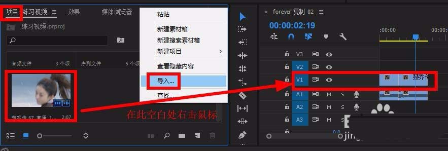 1、打开pr,在“项目”面板空白处右击鼠标,导入两段视频,将视频拖到v1轨道上