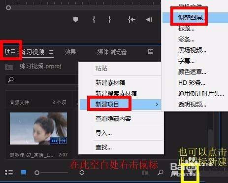 2、在“项目面板”空白处右击鼠标,选择“新建项目”-“调整图层”,弹出窗口点击“确定”
