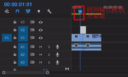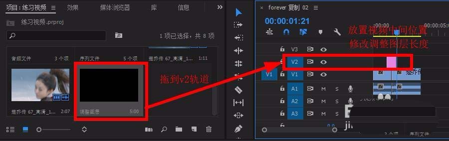 3、将调整图层拖到v2轨道上,放于两段视频中间,作为转场素材,修改调整图层到合适长度