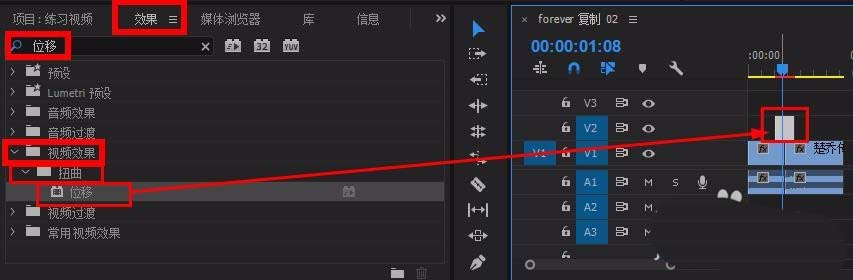 4、在“效果”面板搜索栏输入“位移”,将其拖到调整图层上,(“视频效果”-“扭曲”-“位移”)