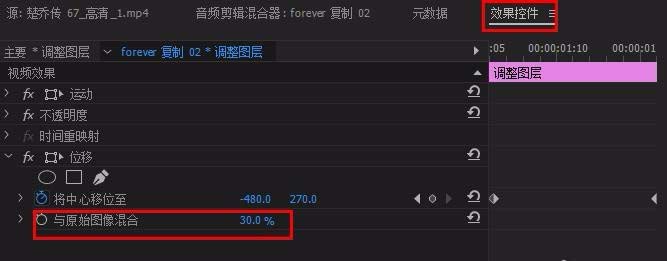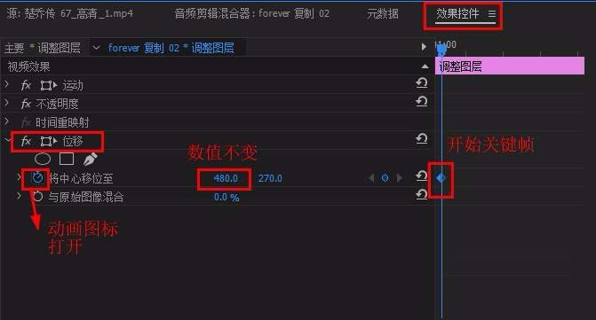 5、选中调整图层,在其“效果控件”面板中找到“位移”,时间标尺移到调整图层开始处,打开“将中心移位至”前面的“动画图标”,设立开始关键帧,数值不变