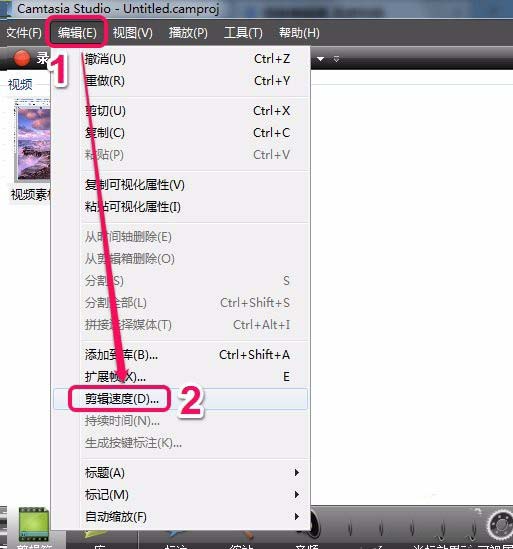 3、打开“编辑”菜单,选择里面的“剪辑速度”命令。