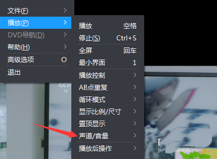 3、进行点击了播放之后,弹出下一级菜单选中为,选中为声道/音量的选项。