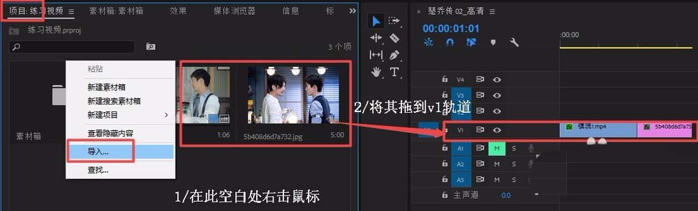 1、打开pr,在“项目”面空白处右击鼠标,选择“导入”,将两段视频导入,拖拽视频1、视频2到v1轨道