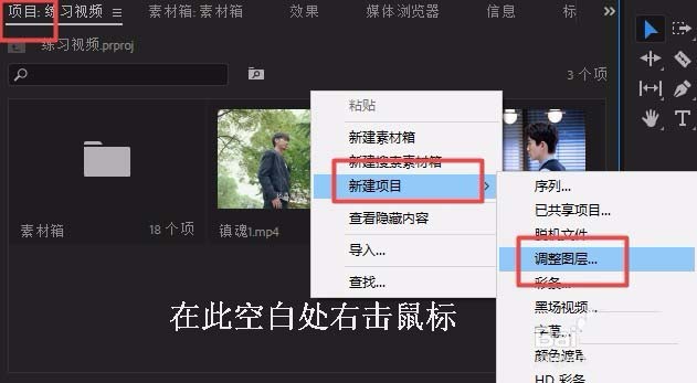 2、在“项目”面板空白处右击鼠标,选择“新建项目”-“调整图层”,点击“确定”