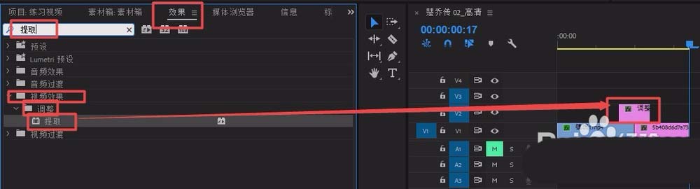 4、在“效果”面板搜索栏输入“提取”,将其放到调整图层上,(“视频效果”-“调整”-“提取”)