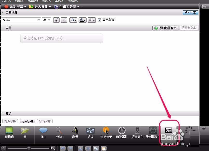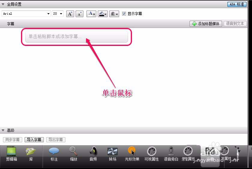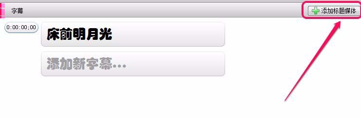 9、我们在创建完第1段字幕后,用鼠标单击右上角的“添加标题媒体”按钮。