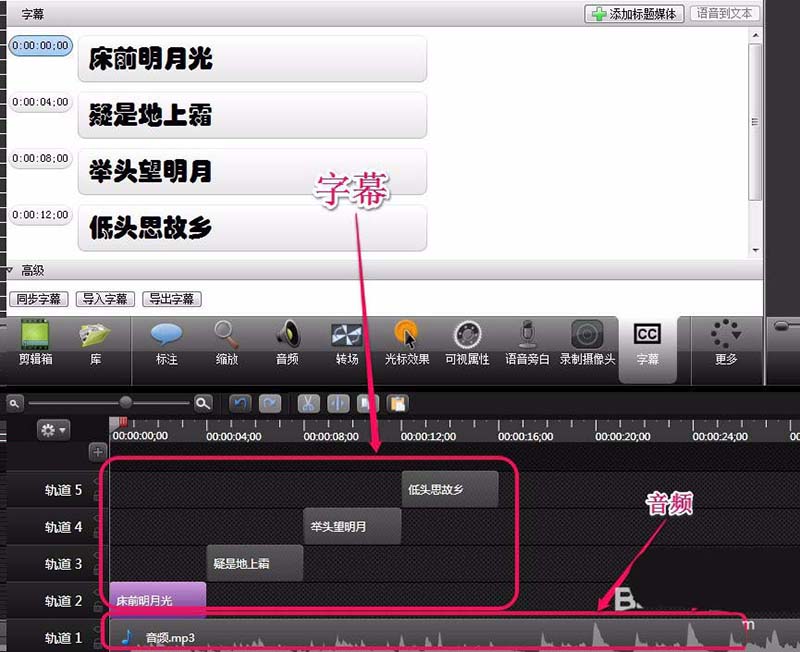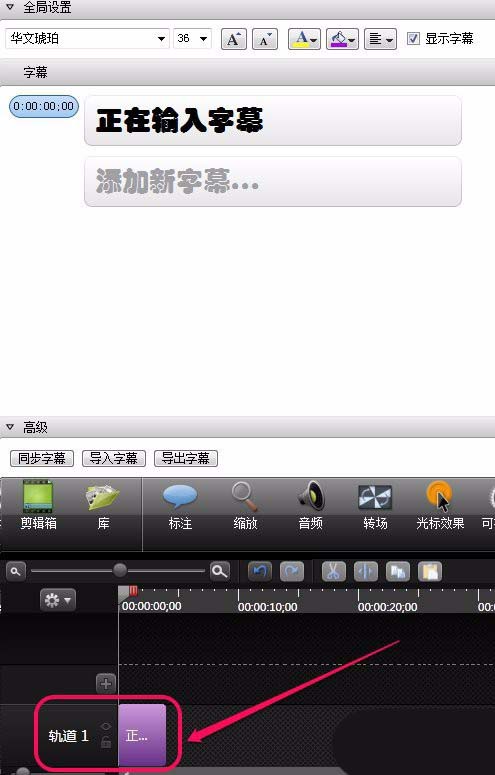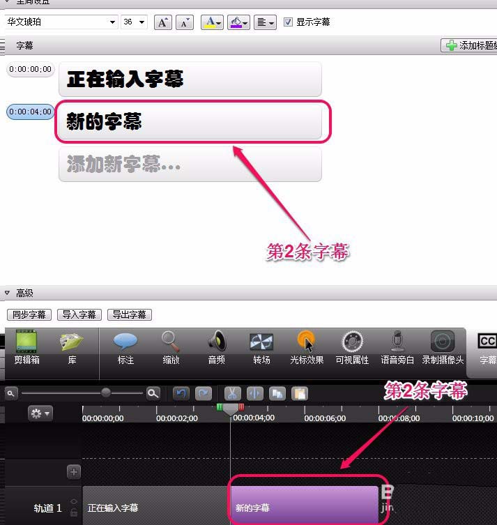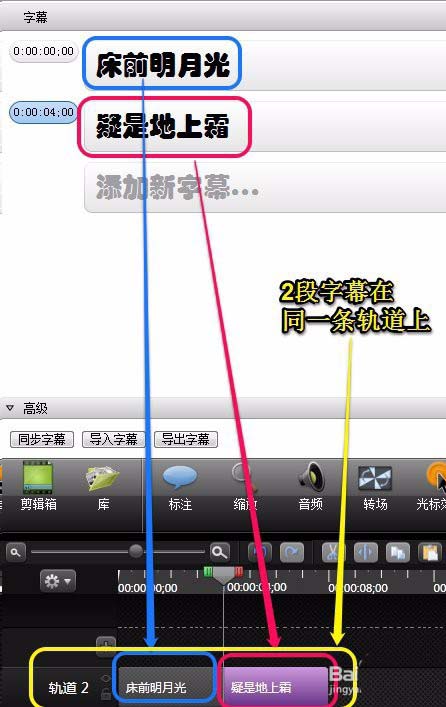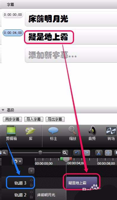 10、这时,软件又新建了轨道3,把新建的字幕媒体放到了轨道3上面。这样,2段字幕就是互不干涉状态了,对于编辑字幕非常方便。