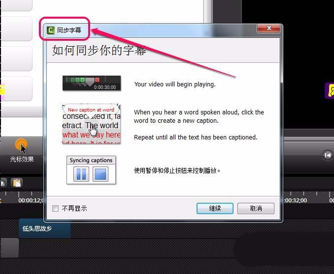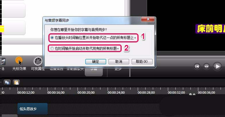 15、又弹出“与音频字幕同步”对话框,第 1 条是指可以在音频的任意位置进行同步操作;第 2 条是指从整个音频的开始位置进行操作。
