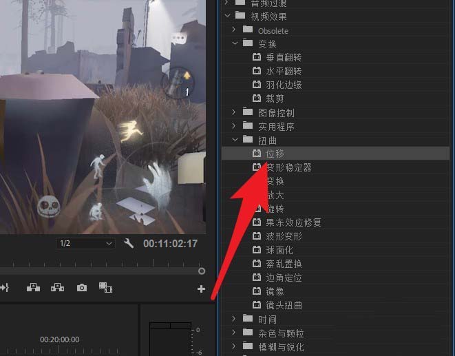 3、在右侧视频效果中找到扭曲下的位移效果插件。