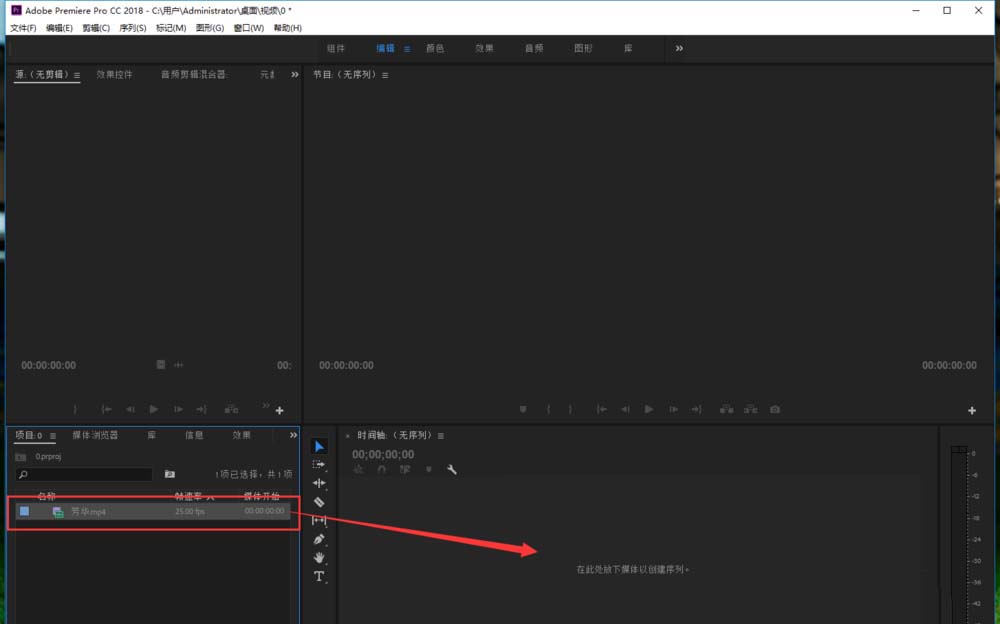 3、拖拽完成后会看到会根据视频素材的尺寸自动创建一个新的序列,拖动时间轴上的蓝色竖条,可以选则播放的时间位置。