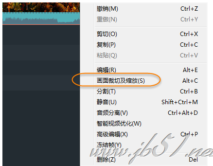 把录好的视频片段导入到时间轨道,点击右键,选择“画面裁切及缩放”可以对视频进行裁切。