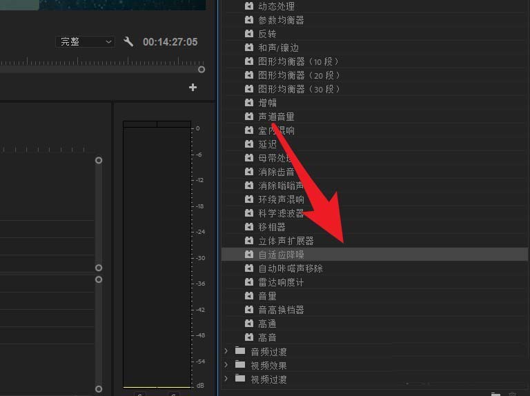 3、然后在效果控件中找到自适应降噪效果插件双击应用。