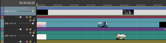 1、使用Vegas添加素材到项目媒体窗口,然后从项目媒体窗口右键拖拽素材到时间线(垂直排列放置素材)。