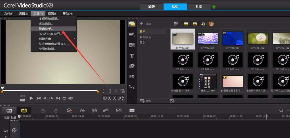 1、打开绘声绘影后,点击“工具”——“影音快手”即可进入影音快手
