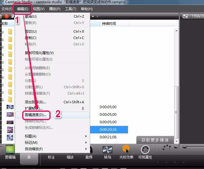 3、打开“编辑”菜单,选择“剪辑速度”命令。