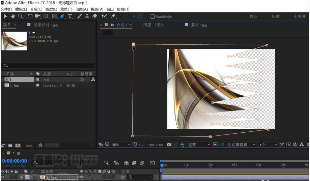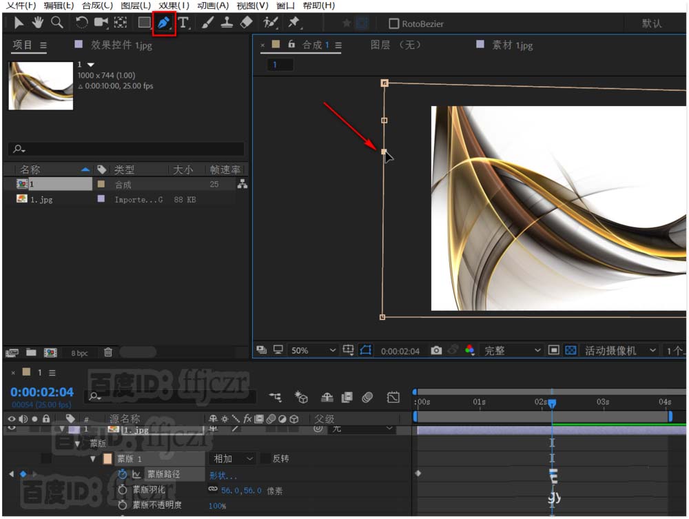 3、遮罩的绘制。鼠标选择合成中的图片,点选钢笔工具;在合成窗口中绘出一个遮罩形状,右边的锯齿状可以令遮罩更生动。
