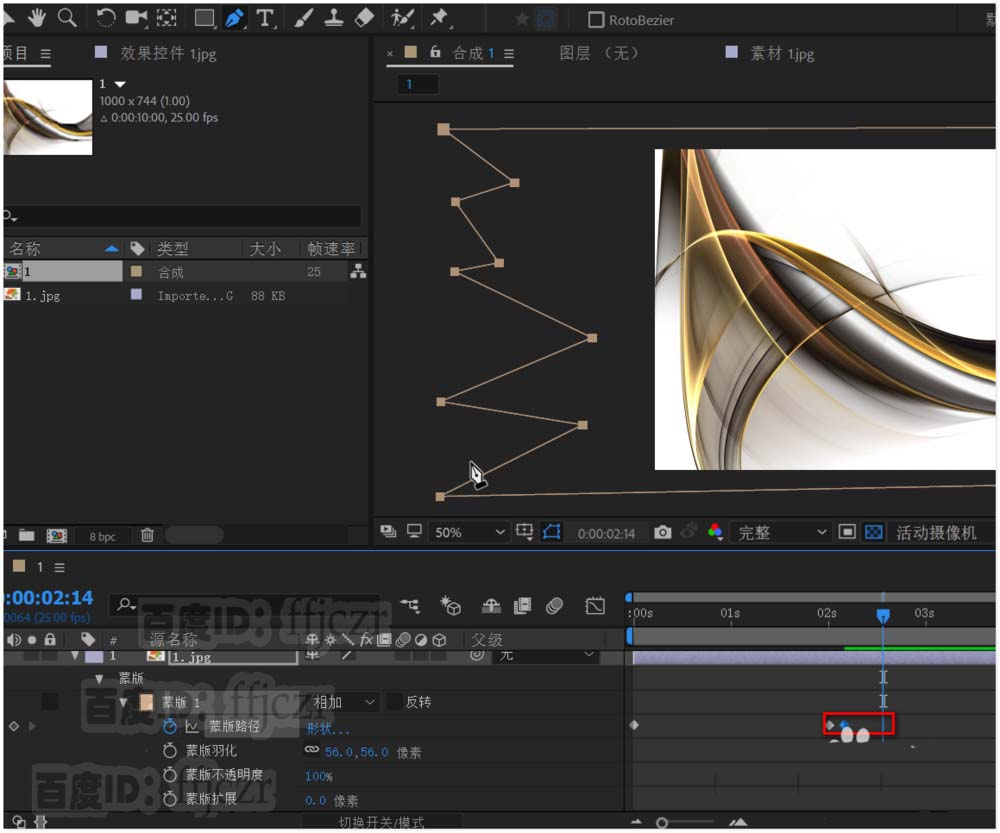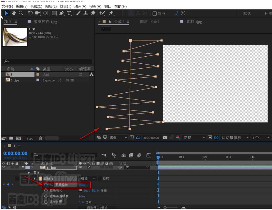 6、创建左端的遮罩动画。选中蒙版路径,用钢笔工具对遮罩左边线添加点,并调整成锯齿状;激活蒙版路径关键帧,时间线为2.5秒。