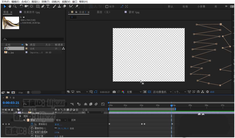 5、创建右端的遮罩动画。激活蒙版路径关键帧,时间线为0,用选择工具选中遮罩形状右边的所有点,用鼠标拖动到左边;时间线为2秒,保持遮罩右边点的选中状态,将其拖到右边。这样一个从左到右的动画生成了。此时播放可以看到图片从0到2秒时生成了一个图片右边逐渐出现的动画。