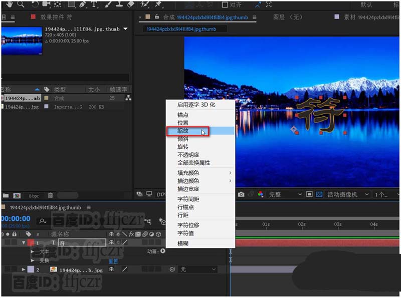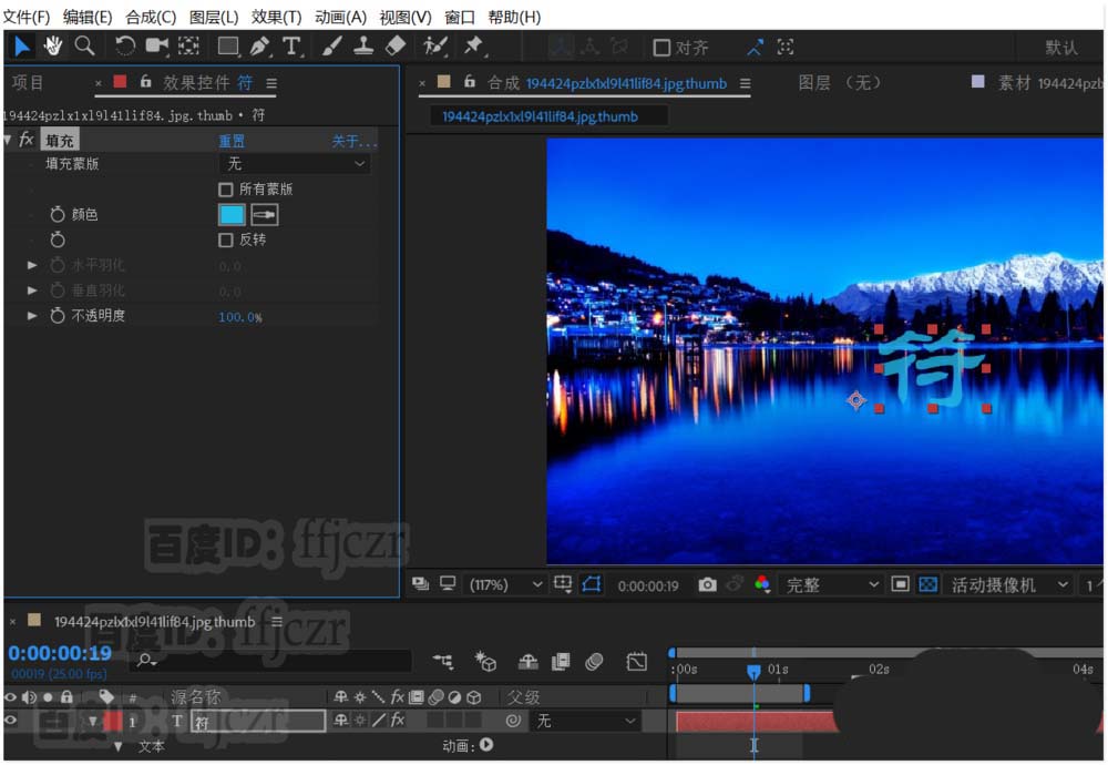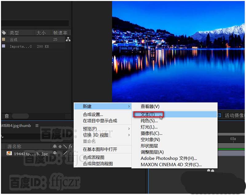 2、在合成层新建一个文本层,在显示区添加上文字,这里只添加一个字。