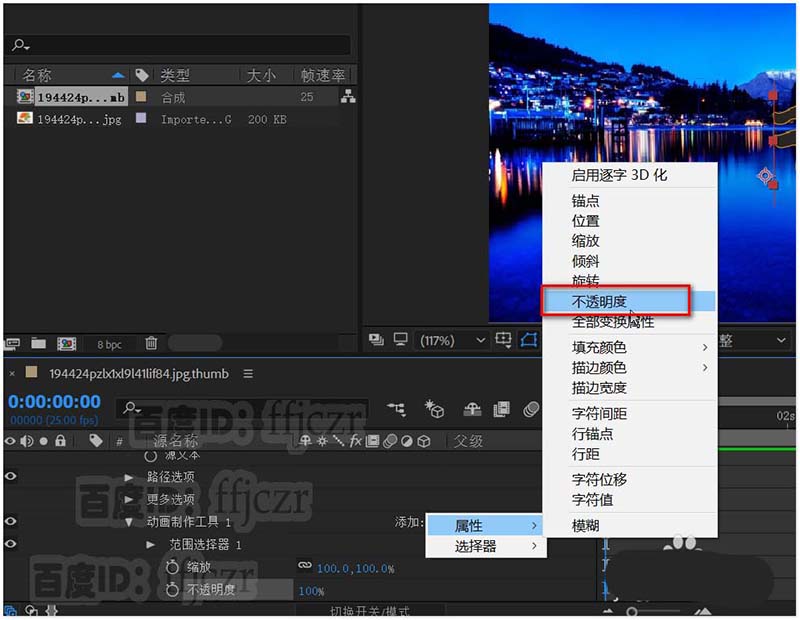 3、先对文字进行动画类型添加,这里添加二个类型动画,分别为:缩放及不透明度。