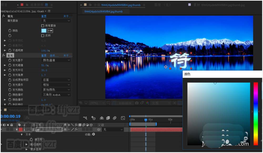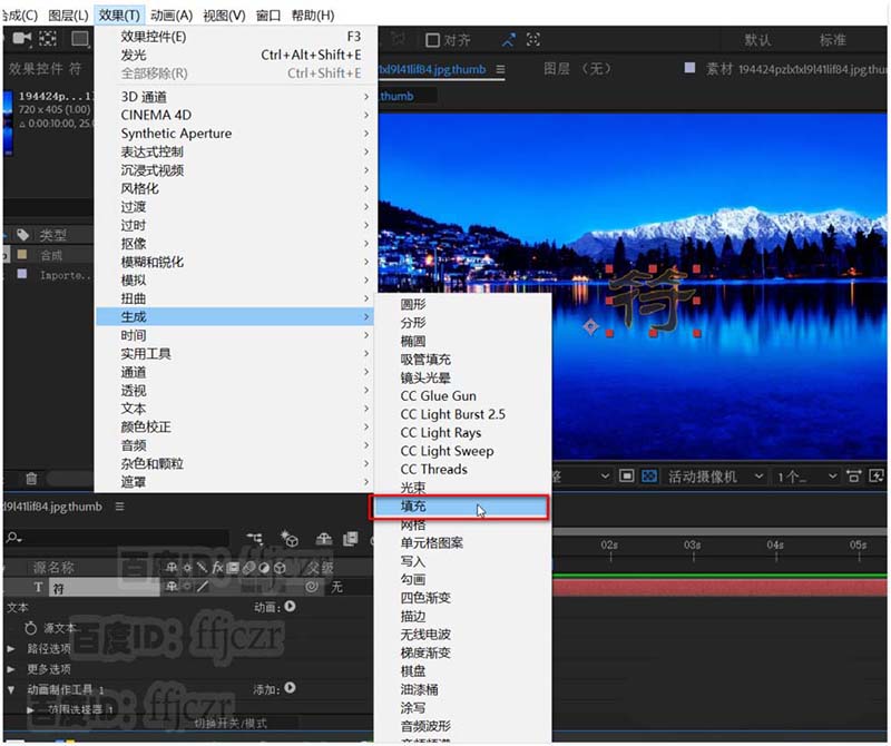 5、给文字添加发光效果。在添加发光效果前,要先对文字填充上相应的颜色。选中文字层,点开效果列表,选择生成--填充。给文字填充上相应的颜色。