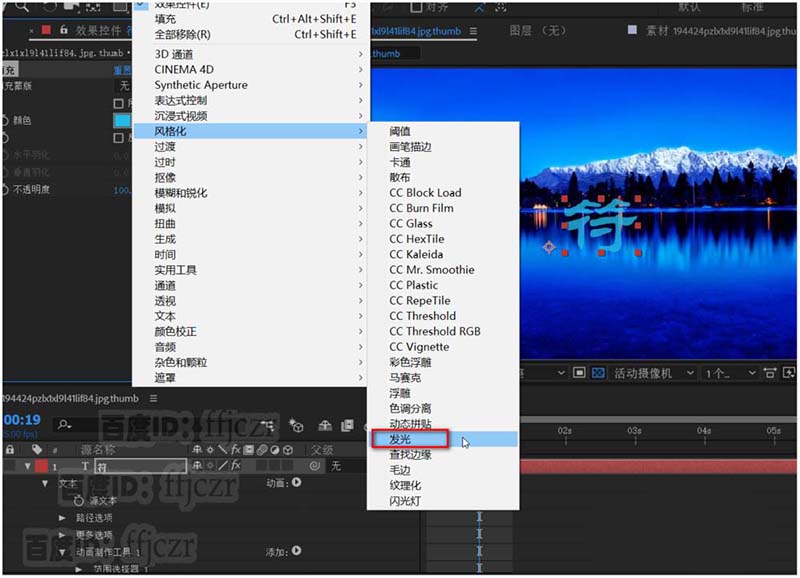 6、选中文字层,点开效果列表,选择风格化--发光。调整发光半径为30(使文 字发出光晕效果),调整颜色,使文字呈内部发光的效果。
