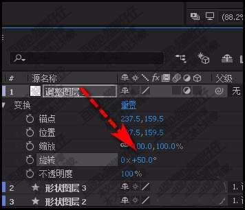 9、点开调整图层的属性选项,在旋转这里设置其旋转角度。比如50度。