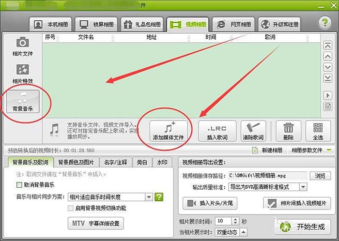 6、选择背景音乐选项卡,单击添加媒体文件按钮。