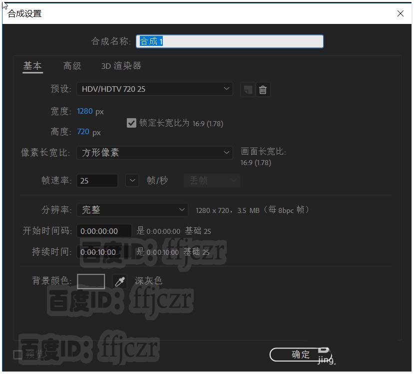 1、新建一个合成文件,分辨率为1280*720;其它参数随意。