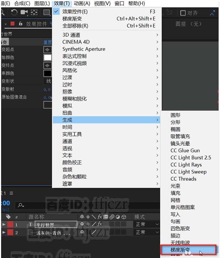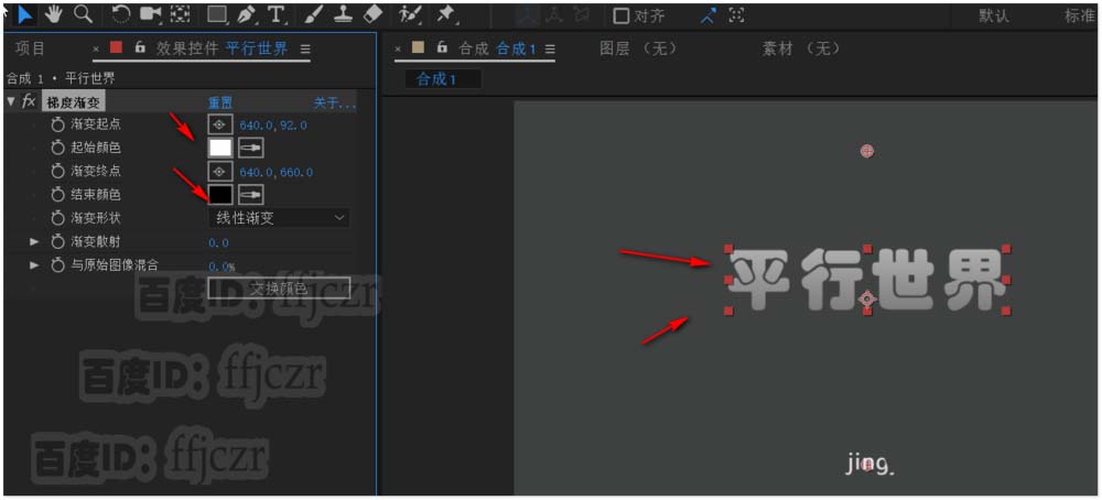 4、这时生成的文字看上去是没有立体感的;选用效果中生成列表中的梯度渐变,在效果控件选项栏中,选用渐变的形状为线性,起始色白色,结束色为灰黑色;此时显示区的文字出现了一个由上向下由白到黑的逐渐变化效果。虽然表面有了色度的变化但还没有凹凸效果。