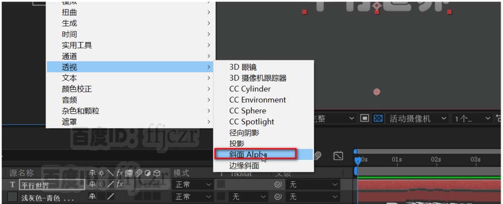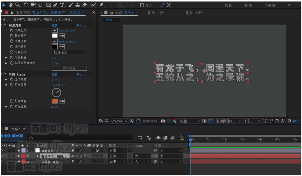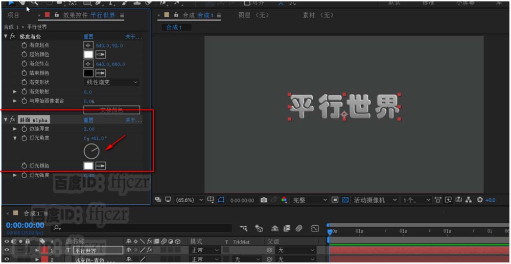 5、选用效果中透视列表中的斜面Alpha,此时的文字产生了凹凸的视觉效果;调整灯光角度到合适位置,调整的时侯效果会实时显示出来的。所以想要什么样的效果,自已看着办吧。以上添加效果操作时,要保证文本层是处于选中的状态。