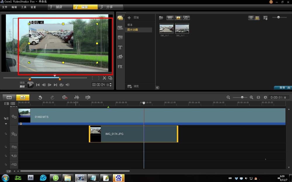 2、点击选中放在“覆叠轨”上的素材,在视频预览窗口会有其素材编辑框出现,就是在素材的周围有虚线和黄色的点出现。