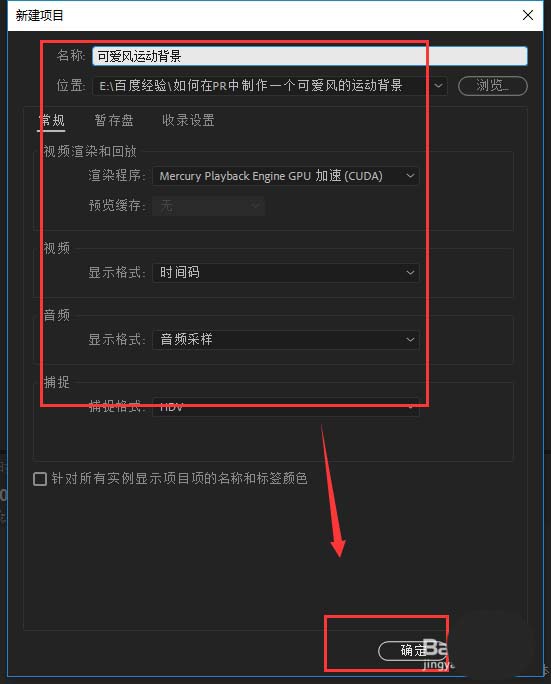 1、打开电脑安装的PR软件,选择新建PR剪辑项目,然后在打开的新建项目窗口中,设置项目的名称为“可爱风运动背景”,其他设置根据自己的需求进行设置即可。然后点击确定。
