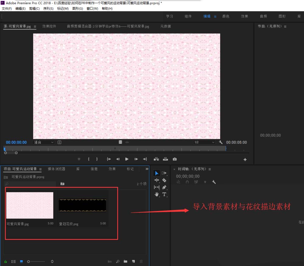2、在PR文件菜单中,执行导入命令,然后在导入的窗口中将一个可爱风背景与一个花纹描边的素材选中导入到PR软件的项目管理窗口中。