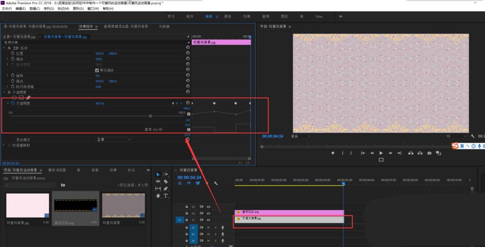 6、在选中可爱风背景素材,当前的背景素材颜色有点盖住花纹,所以打开效果控件,在不透明度选项中设置背景图片素材的不透明度。