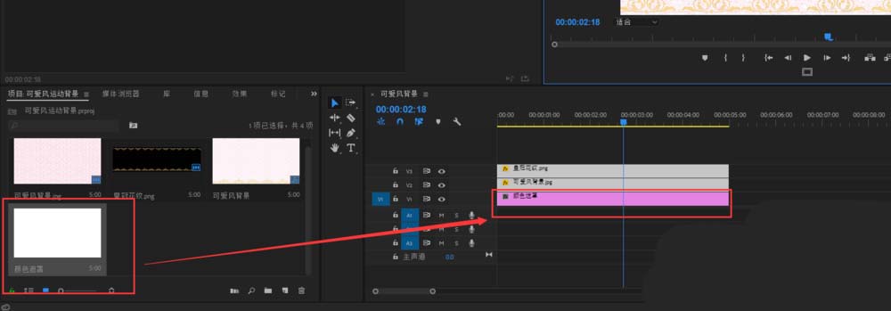 3、分别选中可爱风背景素材与花纹素材,将其分别拖入到时间轴窗口的视频轨道1上面和视频轨道2上。
