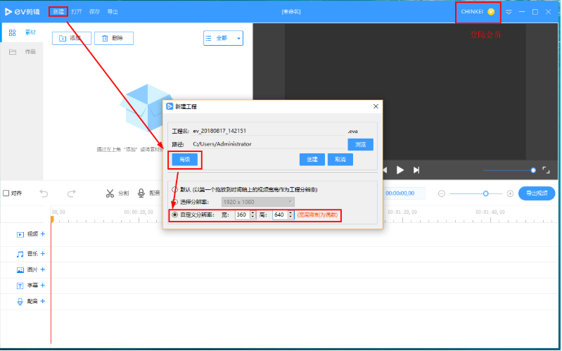 1、打开EV剪辑工具,点击【新建】,选择高级,将分辨率自定义为360X640(或其他),新建画布。