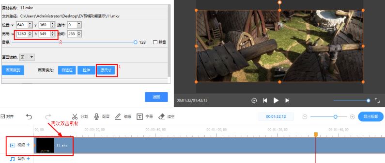 1、打开EV剪辑工具,导入视频素材,双击视频轨道的素材,点击“画面裁剪”,去除上下黑边,
